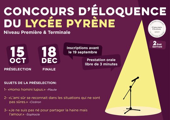 Par Valerie Verdier, publié le vendredi 26 septembre 2025 10:32 - Mis à jour le vendredi 26 septembre 2025 10:35Le concours CICÉRON est lancé ! Prolongation des inscriptions jusqu'au vendredi 03 octobre 2025 ! N'hésitez pas à tenter votre chance ! Vous trouverez dans l'article, une présentation, la fiche d'inscription et le règlement du concours. -