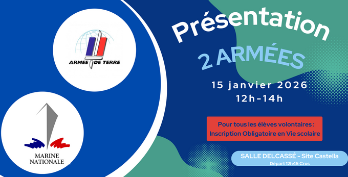 Par Valerie Verdier, publié le mercredi 7 janvier 2026 16:04 - Mis à jour le mercredi 7 janvier 2026 16:04Le jeudi 15 janvier 2026 de 12h à 14h en salle Delcassé, site Castella, présence des 2 armées pour échanger avec les élèves qui le souhaitent. Venez nombreux les découvrir !!! -