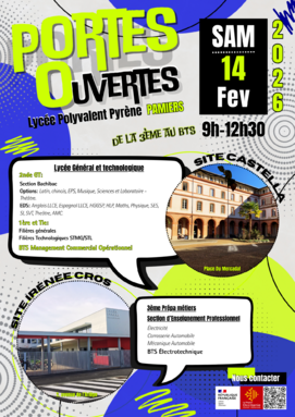 Par admin castella, publié le jeudi 8 janvier 2026 15:49 - Mis à jour le jeudi 8 janvier 2026 15:51Samedi 14 février 2026 entre 9h00 et 12h30, le lycée polyvalent Pyrène de Pamiers organise ses portes ouvertes sur les sites du Castella et Irénée Cros. Nous vous attendons nombreux. -